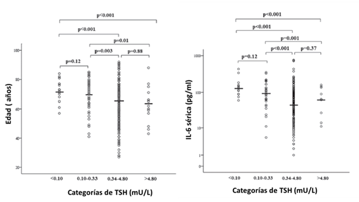Los valores de TSH sérica se correlacionaron inversamente con la edad. Pacientes con TSH por debajo 0,34 mU/L eran significativamente mayores en comparación con aquellos con TSH más altas, sin diferencias significativas entre <0,10 y 0,10–0,33 mU/L. Se midió la IL-6 sérica en 210 pacientes y resultó estar correlacionada significativamente con los valores de TSH y la edad. Los valores séricos de IL-6 fueron significativamente más altos en pacientes con TSH <0,34 mU/L en comparación con aquellos con valores más altos de TSH, sin diferencias significativas entre <0,10 y 0,1-0,33 mU/L.