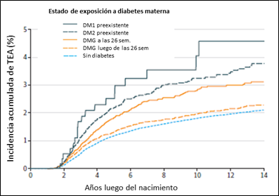 Las tasas anuales de incidencia de TEA por cada 1000 niños fueron de 4,4 para los hijos de madres con DM1; 3.6 para hijos de madres con DM2; 2.9 para DMG a las 26 semanas; 2.1 para DMG después de 26 semanas; y 1.8 para aquellos con madres sin diabetes (ver tabla y figura 1).
