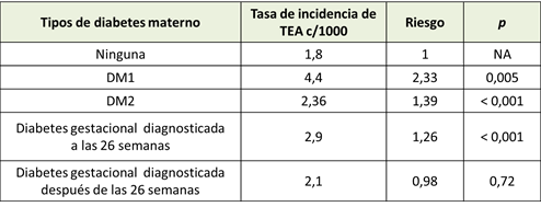 Tabla 1: tasa de incidencia y riesgo de TEA según la exposición materna a la diabetes