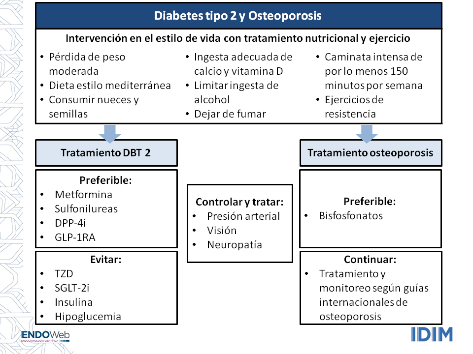 Tanto la DBT 2 como la osteoporosis se ven afectadas por el envejecimiento y los cambios en el estilo de vida. Estas dos entidades clínicas con frecuencia coexisten y los medicamentos utilizados para cada una pueden afectar a la otra. La dieta saludable y el ejercicio físico son muy importantes para la prevención y el tratamiento de ambas. La metformina, las sulfonilureas, DPP-4i y GLP-1RA son las drogas preferidas para el tratamiento de la DBT 2 en pacientes con osteoporosis, mientras que deben evitarse objetivos estrictos de glucemia por temor a hipoglucemia, caídas y fracturas. La insulina debe usarse con precaución y con medidas cuidadosas para evitar la hipoglucemia. Se deben evitar las TZD y la canagliflozina, mientras que otras SGLT-2i son opciones menos validadas.