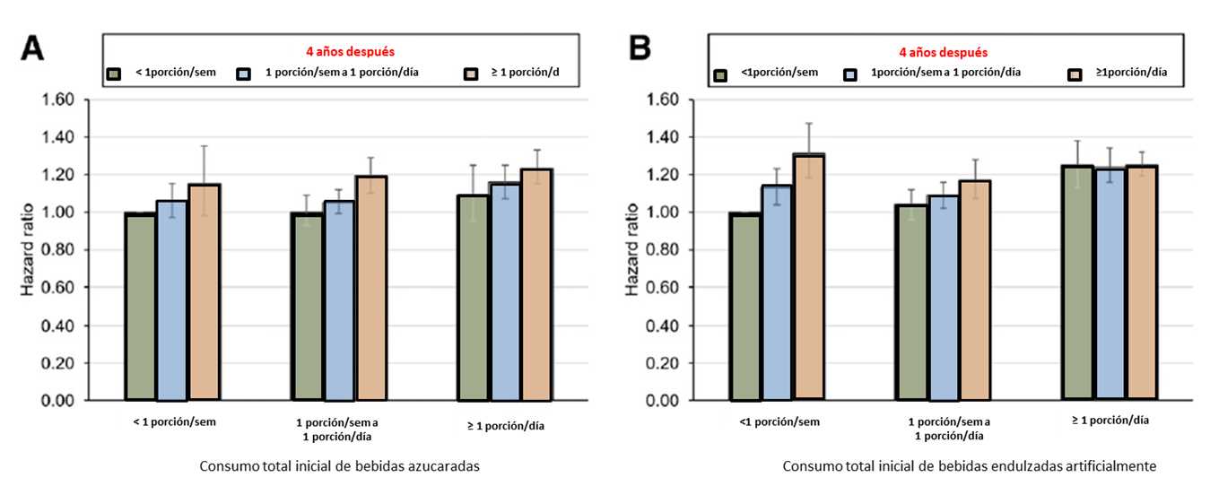 Como podemos ver en la Fig 1, en comparación con los participantes que consumieron < 1 porción/semana de bebidas azucaradas durante 4 años, las personas que aumentaron su consumo a â¥1 porción/día tuvieron un mayor riesgo de diabetes en los 4 años posteriores (HR 1,15). Las personas cuyo consumo disminuyó de â¥1 porción /día a <1 porción / semana tuvieron 9% de riesgo de diabetes, mientras que aquellos que consumieron â¥1 porción/día durante 4 años tenían 23% mayor riesgo de diabetes. Para el consumo de ASB, cualquier aumento en el consumo se asoció con un mayor riesgo de diabetes en comparación con la categoría de ASB de referencia (<1 porción / semana durante 4 años).