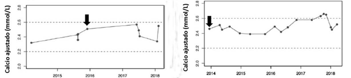 Figura 1: Patrones de comportamiento del calcio ejemplificado en 2 pacientes: A normocalcemia persistente; B hipercalcemia intermitente