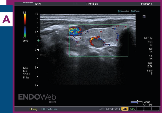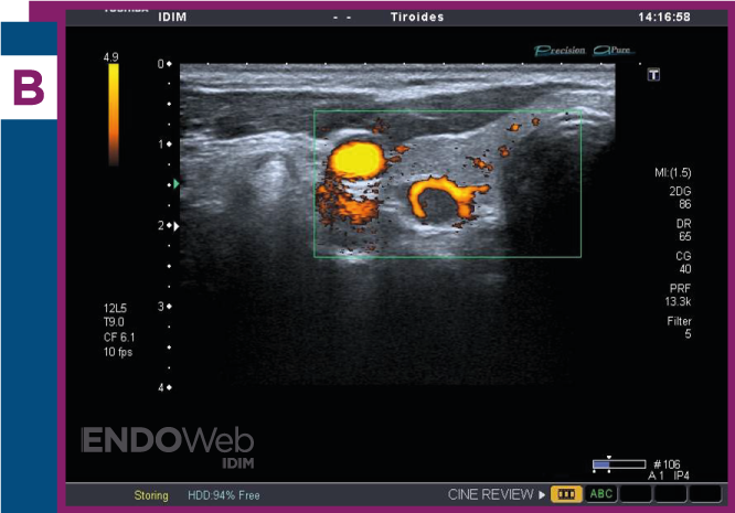 Ecografía cervical, donde se observa en topografía paratiroidea, nódulo sólido e hipoecoico, con imagen al doppler compatible con signo del arco vascular que rodea nódulo paratiroideo en más de 180° de su contorno y se visualiza en las imágenes al doppler color (A) y doppler power (B).