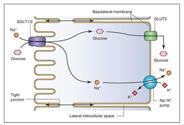 El primer paso en la reabsorción de glucosa desde la orina es el pasaje desde la luz tubular a las células epiteliales tubulares, a cargo del SGLT. Se tratan de proteínas de membrana que transportan glucosa, aminoácidos, vitaminas, iones y osmolitos desde la membrana de reborde en cepillo del TCP y del intestino. Tanto la expresión como la función de los SGLT2 están aumentados en la DM 2.