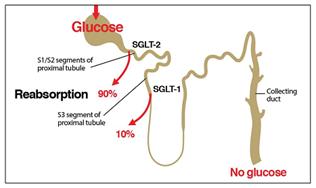 La inhibición de la reabsorción tubular renal de glucosa (a través de los inhibidores de la reabsorción), lleva a un descenso de la glucemia a través del aumento de su excreción renal, que con los inhibidores llega al darse a los ~ 70-90 mg%. Esto se trata de una novedosa terapia antidiabética eficaz independiente del grado de insulino-resistencia, presencia de insulina, y magnitud de la falla celular beta. Esta inhibición demostró ser igualmente eficaz tanto en diabéticos de reciente diagnóstico, como en diabéticos con más de 10 años de enfermedad. Además demostró beneficios adicionales tales como: pérdida de peso, baja índice de hipoglucemia, y reducción de la presión arterial (PA).
