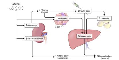 Un reporte reciente (Bonner et al. Nat Med 2015; 21:512-27), informa que los SGLT2 (y SGLT1) se expresan en células α, y que este transportador funcionaría como un glucosensor de estas células. Informa además que la exposición de dapagliflozina a islotes humanos de células α aumentó la secreción de glucagón. Esto podría a su vez llevar a un aumento en la producción de cuerpos cetónicos.