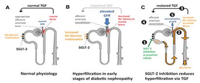 La hiperglucemia relacionada a la diabetes aumenta la llegada de glucosa al TCP. Esto aumenta la reabsorción proximal de glucosa y Na+ por el aumento de la expresión y actividad de ARNm de SGLT2. A su vez, esto lleva a un descenso de Na+ en la mácula densa, lo que es sensado como un descenso del volumen circulante efectivo por el aparato yuxtaglomerular. Esto causa vasodilatación aferente, aumento de la presión intraglomerular e hiperfiltración, que conduce a nefropatía.
