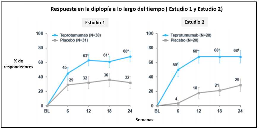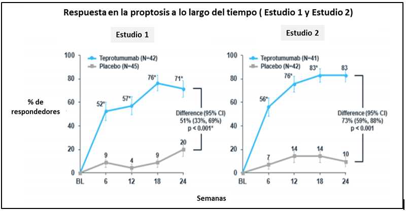 El teprotumumab fue efectivo en dos estudios clínicos controlados 2, proporcionando mejoras estadísticamente y clínicamente significativas en múltiples facetas de esta patología. Una gran mayoría de pacientes logró mejoras sustanciales en proptosis, puntaje de actividad clínica (CAS), diplopía y calidad de vida con 24 semanas de terapia.