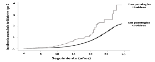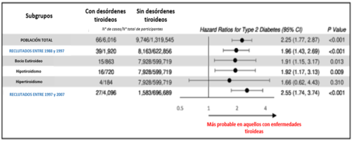 En este estudio de cohorte histórico poblacional a nivel nacional, se informó que la presencia de trastornos tiroideos entre los adolescentes de ambos sexos, otorgaba un riesgo aproximadamente dos veces mayor de aparición temprana de DM2. La asociación fue además demostrada para bocio eutiroideo e hipotiroidismo y fue evidente antes de los 30 años (ver TABLA 1) Estudios previos longitudinales poblacionales que evaluaron el riesgo de diabetes tipo 2 entre personas con trastornos tiroideos clínicamente diagnosticados, generalmente incluían adultos en una amplia gama de edades (la mayoría de ellos en su quinta década de vida) y con un seguimiento medio inferior a ocho años. Ãstos arrojaron cocientes de riesgo entre 1,2 y 1,5, con estimaciones similares entre aquellos con hipotiroidismo e hipertiroidismo. Los cambios hormonales tiroideos en ambas direcciones, incluso en el rango normal aceptado, se asociaron con mayor riesgo de diabetes.