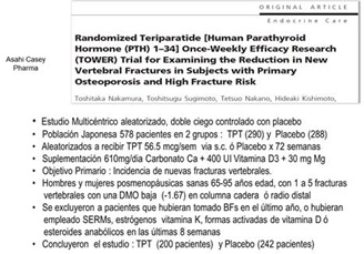 Siempre me pregunté por qué no se le dio la difusión adecuada a otras formas alternativas de administrar TPTD para el tratamiento de la osteoporosis postmenopáusica, como por ejemplo la forma de administración utilizada por el grupo japonés de Toshitaka Nakamura y cols (1), en el estudio TOWER publicado en 2012, con la aplicación de TPTD en una dosis semanal de 56.5 ug subcutáneo vs placebo.