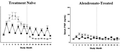 Por otra parte, la aplicación cíclica de 3 meses ON/OFF de TPTD sube los niveles de los marcadores de remodelado óseo cada vez que se aplica el ciclo ON y disminuyen al valor basal en el ciclo OFF.