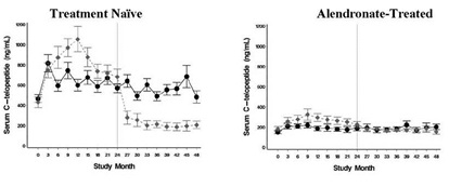 Llama la atención que los marcadores de formación (Osteocalcina y P1NP) y de resorción (CrossLaps sérico) se comporten prácticamente de igual manera aumentando en forma importante en los primeros 12 meses para después declinar hasta llegar a los 24 meses a valores basales y los siguientes 2 años mantenerse por debajo de los valores normales.