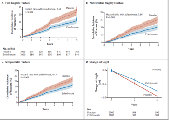 Se produjo una fractura por fragilidad en 190 mujeres en el grupo placebo y en 122 en el grupo zoledronato (cociente de riesgo (HR) con zoledronato, 0.63; intervalo de confianza del 95%, 0.50 a 0.79; P <0.001). En base a estos resultados el número de mujeres que necesitarían ser tratadas para prevenir la ocurrencia de una fractura en una sola mujer fue de 15.
