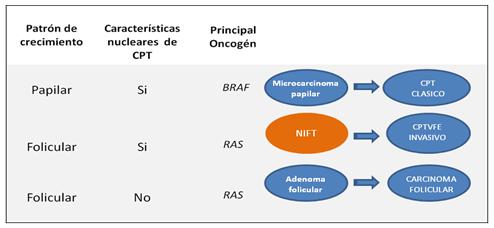 En base a los hallazgos moleculares, la mayoría de las lesiones son impulsadas por alteraciones genéticas clonales diferenciando estas neoplasias de las proliferaciones hiperplásicas. Se postula que el NIFTP representaría la forma benigna o precursora del CPTVFE invasivo y que la ausencia de invasión conllevaría un riesgo muy bajo de complicaciones a largo plazo, por lo que no sería correcta la denominación “Cáncer”.