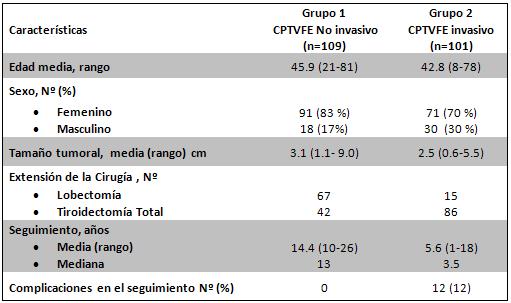 De las 130 muestras incluidas en el grupo 2, fueron excluidas 29. En los 101 casos restantes, se evidenció invasión de la capsula tumoral (n=80), invasión vascular (n=12) o de ambas (n=9). En el seguimiento a largo plazo, 85 pacientes recibieron tratamiento con yodo y 12 presentaron complicaciones: cinco desarrollaron metástasis a distancia y dos de ellos murieron, uno con persistencia de la enfermedad, uno con recurrencia ganglionar y cinco con persistencia bioquímica.