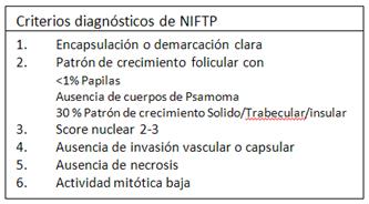 Finalmente, en marzo del 2015, el grupo de trabajo convocado en Boston, analizó los hallazgos histológicos y clínicos, y la nueva nomenclatura fue establecida por consenso. El término "neoplasia folicular de tiroides no invasiva con características nucleares del carcinoma papilar" (NIFTP) fue aceptado con el objetivo de ofrecer una designación que refleje las siguientes características: