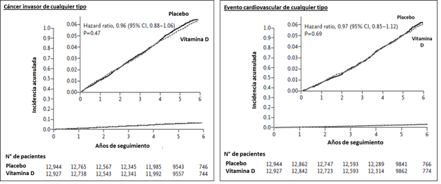 La suplementación con vitamina D no se asoció con un menor riesgo de ninguno de los end point primarios. Durante una mediana de seguimiento de 5.3 años, se diagnosticó cáncer en 1617 participantes (793 en el grupo de vitamina D y 824 en el placebo grupo; relación de riesgo 0.96; Intervalo de confianza del 95% [IC], 0.88 a 1.06; P = 0.47). Se produjo algún evento cardiovascular importante en 805 participantes (396 en el grupo de vitamina D y 409 en el grupo de placebo; índice de riesgo 0.97; IC del 95%, 0.85 a 1.12; P = 0.69).